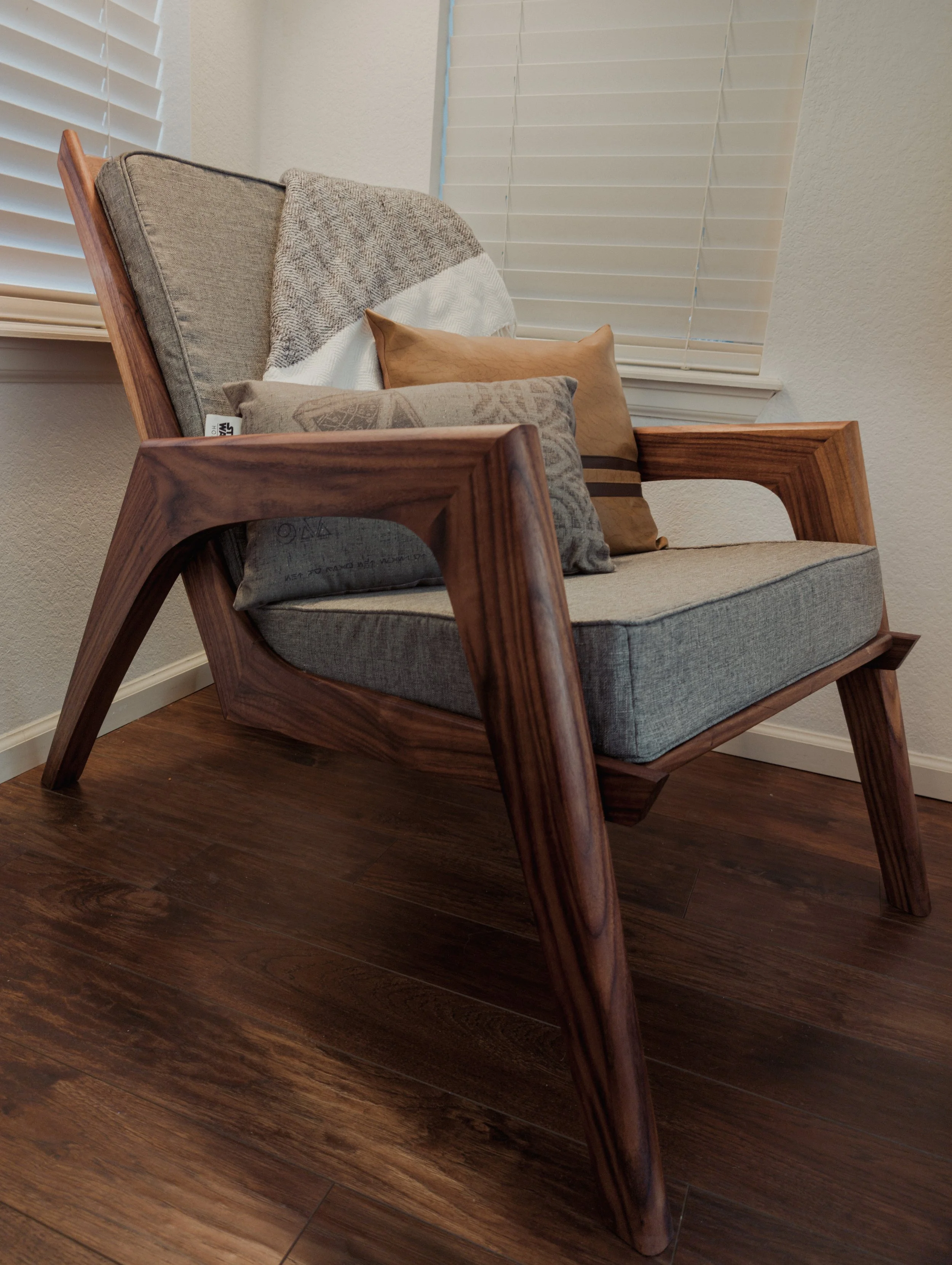 This chair beautiful chair was designed by Shaun Boyd. The chair was built from solid Walnut with Beechwood accents, this lounge chair pairs a bold, sculpted frame with deep, custom tailored cushions. The low, relaxed posture and clean lines highlight the natural character of the wood while keeping the form simple and honest. It’s a comfortable, thoughtfully built piece meant to hold up to everyday living.