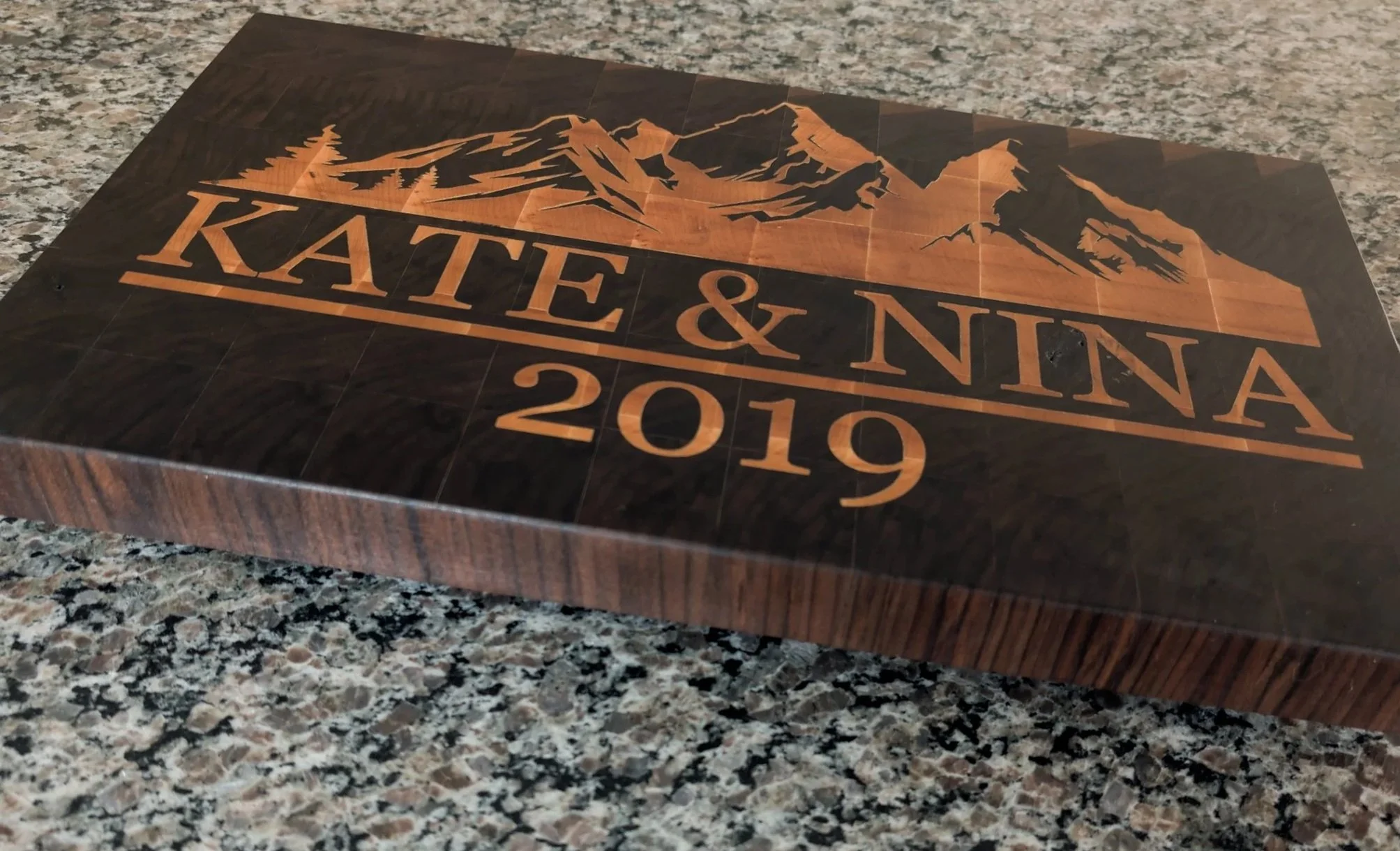 This walnut and maple inlay cutting board was made using a CNC router to commemorate a client’s anniversary. The light maple inlay contrasts against the dark walnut, capturing a mountain silhouette, names, and date in crisp detail. Built from durable end grain, it’s both a functional kitchen piece and a lasting personal keepsake.